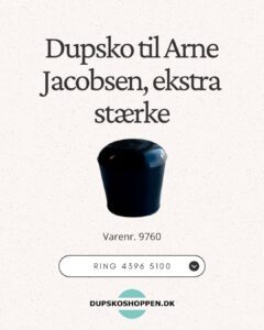 Ekstra stærke dupsko (varenr. 97601413 og 97601913 vælges under “Mål”). Når du har sten- eller betongulv, er Hytrel et godt valg. Vi har dem i str. Ø14 og Ø19 (vælges under “Mål.”) Varenr. på str. Ø14 er 97601413 og Ø19 har varenr. 97601913 under “Dupsko til stole- og bordben mv (Arne Jacobsen).” Materialet Hytrel er mere sejt og mindst 10 gange bedre mod betongulv, og tager ikke så meget mod sand.